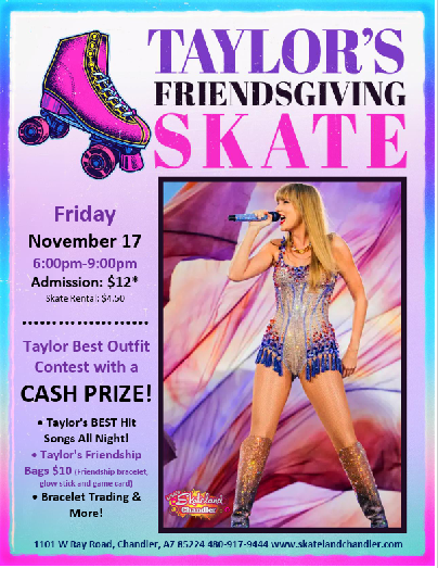 Hey Swifties, we have a special night just for you! Come Skate with Us! Friday, November 17 6:00pm - 9:00pm Admission: $12.00* Skate Rental: $4.50 We will be playing the best Taylor Swift Songs all session long. Dress up in you best Taylor outfit or ERA for the dress up contest. Trade Friendship bracelets. One […]