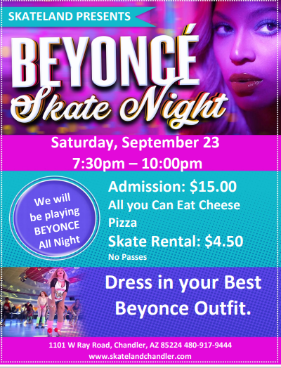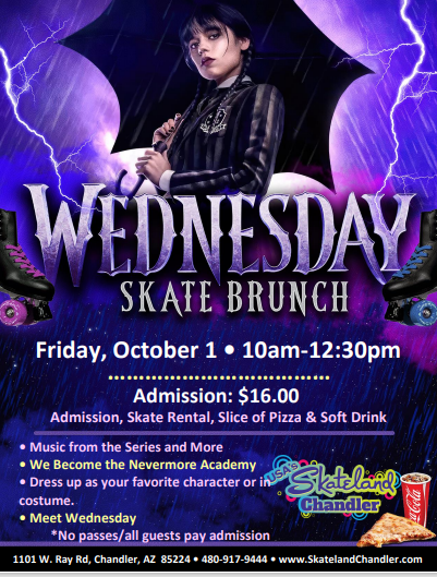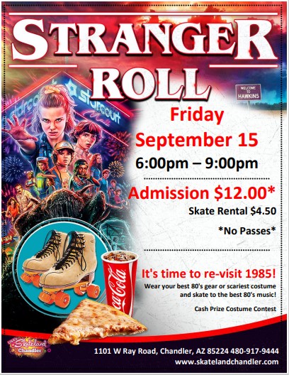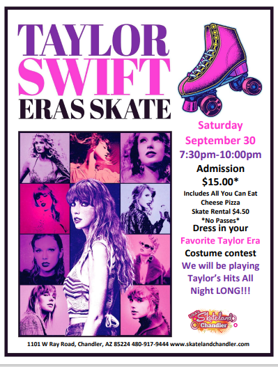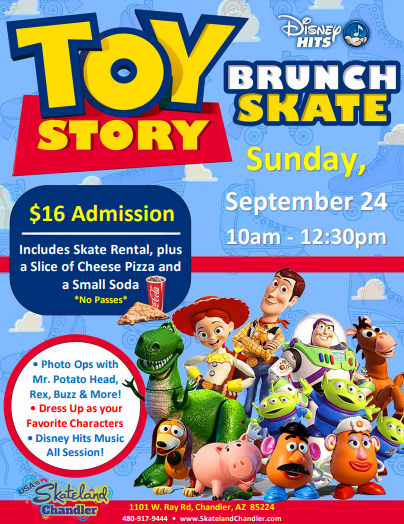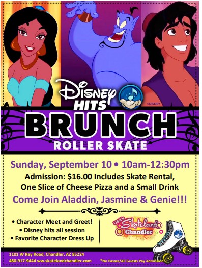 Sunday, September 10, 2023 10:00am - 12:30pm Admission: $16.00 includes skate rental, one slice of cheese pizza and a small drink *No Passes/All guests Pay Admission* Meet and Greets with Aladdin, Jasmine and Genie Disney Hits all session long Dress up as one of your favorite characters.