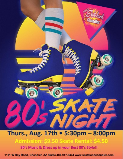 Thursday. August 17, 2023 5:30pm - 8:00pm Admission: $9.50 Skate Rental: $4.50 80's music all session long Come dress in your best 80's attire