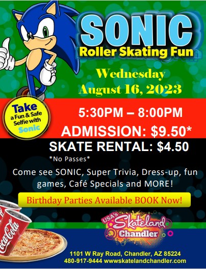 Come meet Sonic Wednesday, August 16, 2023 5:30pm - 8:00pm Admission: $9.50 Skate Rental: $4.50 Photo ops, meet and greets, café specials and more