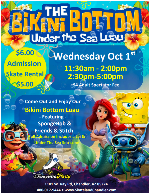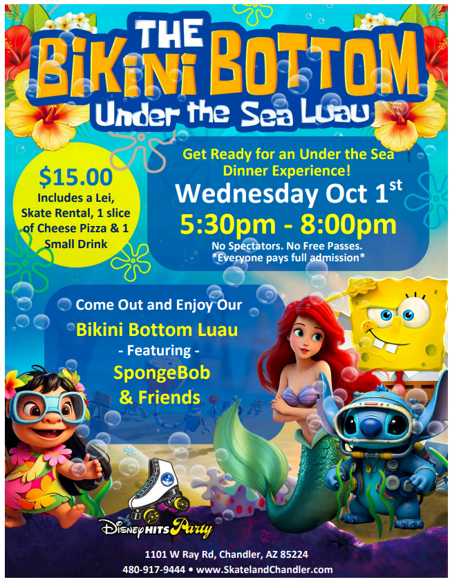 🌊🍕✨ Bikini Bottom Under the Sea Luau – Free Dinner Skate! ✨🍕🌊 Oct 1 🌊🍕✨ Bikini Bottom Under the Sea Luau – Free Dinner Skate! ✨🍕🌊 5:30 pm - 8:00 pm