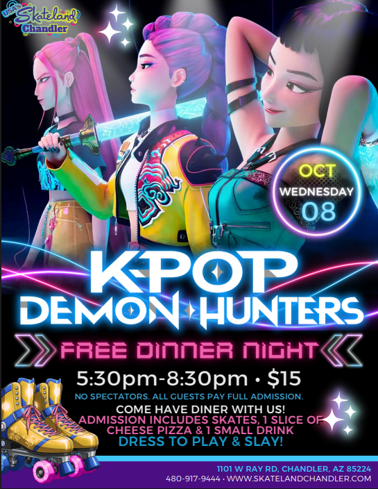 🌟 K-Pop Demon Hunters Free Dinner Night at Skateland Chandler! 🌟 Oct 8 🌟 K-Pop Demon Hunters Free Dinner Night at Skateland Chandler! 🌟 5:30 pm - 8:30 pm
