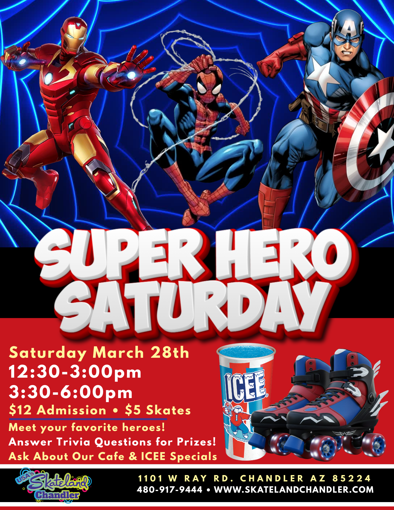 🦸♂️🛡️🛼 Superhero Saturday: Marvel Hits Skate 🛼🛡️🦸♀️ Mar 28 🦸♂️🛡️🛼 Superhero Saturday: Marvel Hits Skate 🛼🛡️🦸♀️ 12:30 pm - 3:00 pm