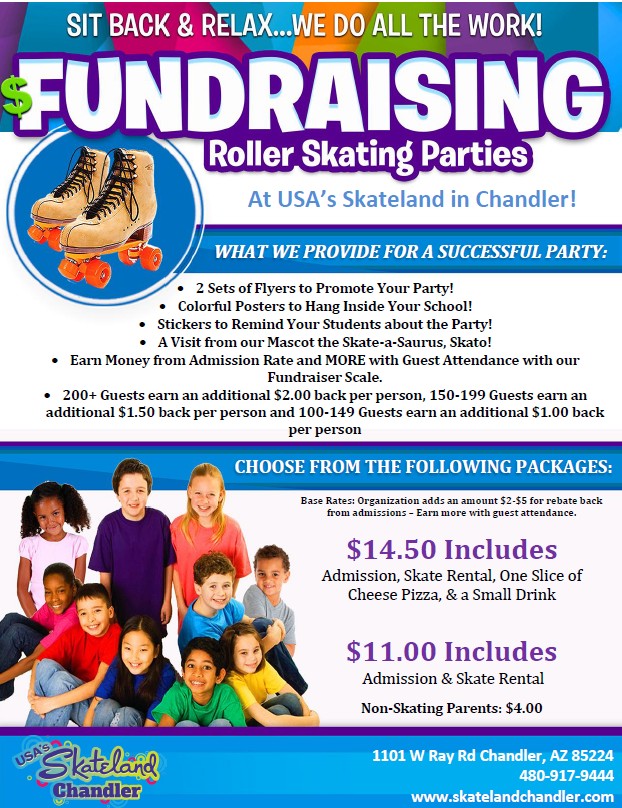 Raise funds for your school, group, or church while you skate! We’ll provide all the marketing pieces so all you have to do is spread the word and show up. Choose from one of our packages below and contact us to get your fundraiser set up. We do all the work and you have all the fun!