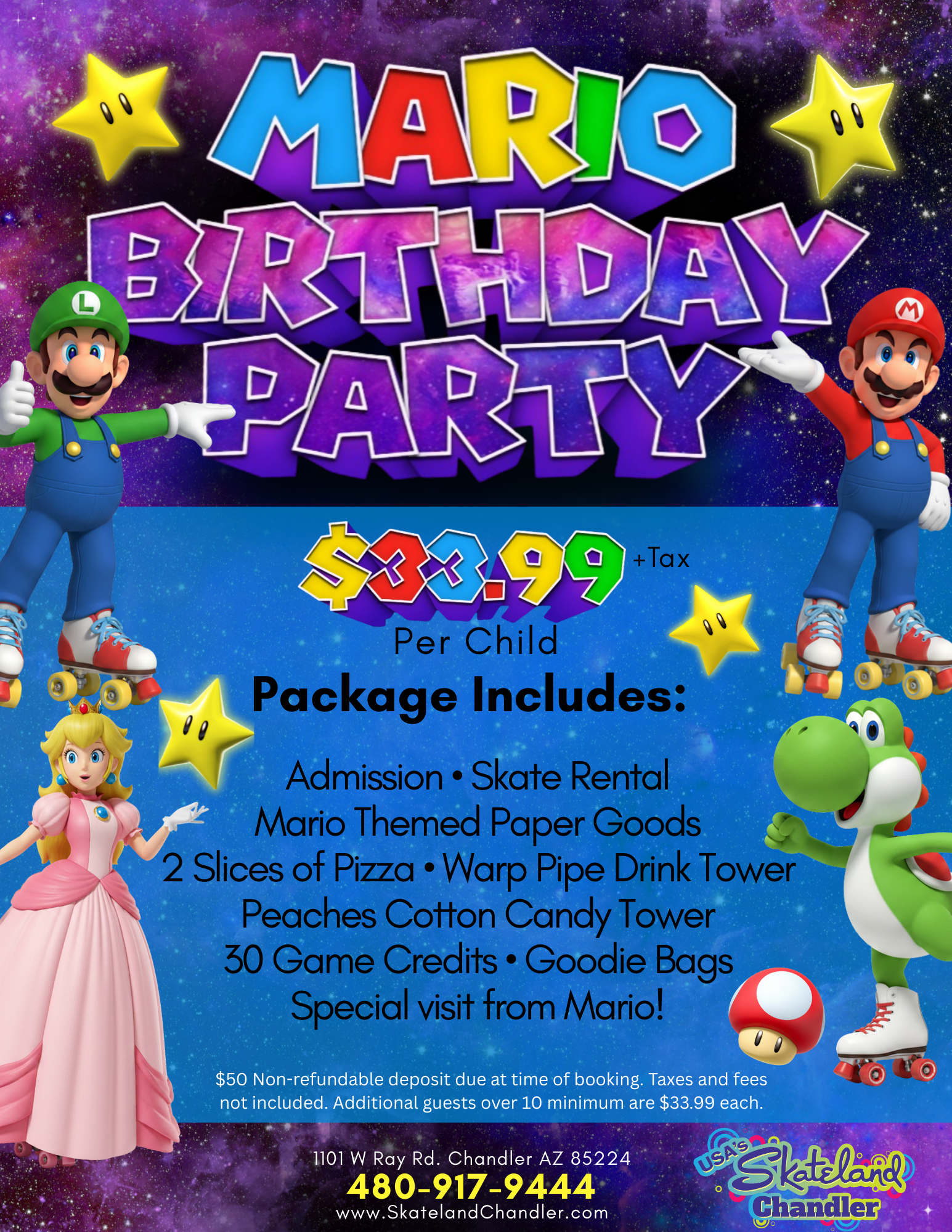 $50 Non-refundable deposit required to secure birthday party. Payment due at time of party. Minimum of 10 party guests required for each party (unless otherwise noted). 2 chaperones skate free per party. *Gratuity and tax not included in price* We accept VISA, MASTERCARD, AMERICAN EXPRESS or DISCOVER. 3.5% Processing fee charged on all card transactions.