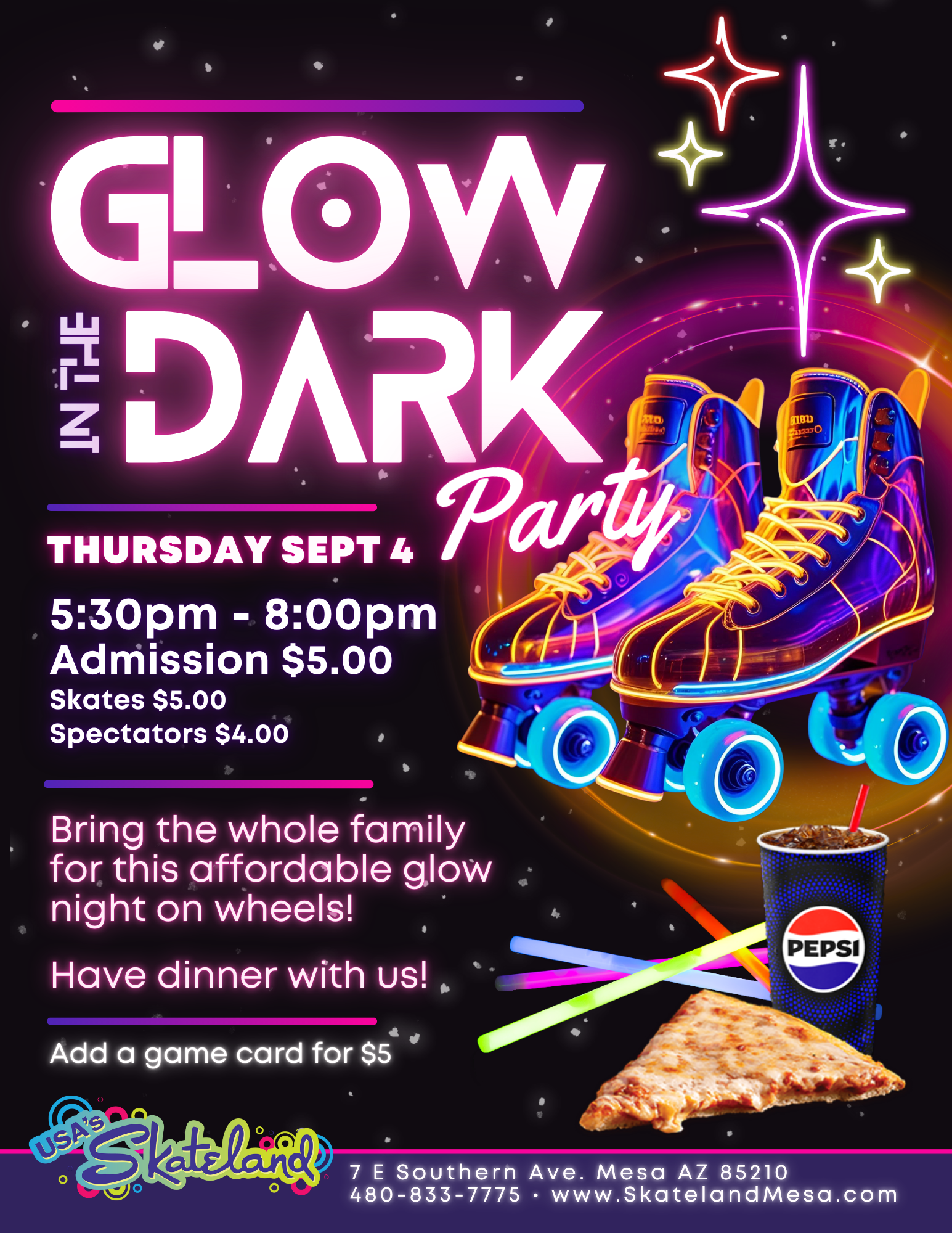 Come skate and shine at our Glow in the Dark Party on Thursday, Sept 4 from 5:30 pm – 8:00 pm!