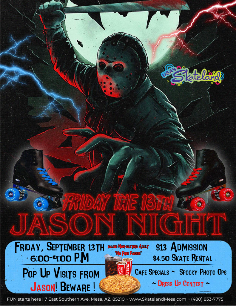 Join us from 6:00-9:00 P.M for a spooky Friday the 13th skate party !