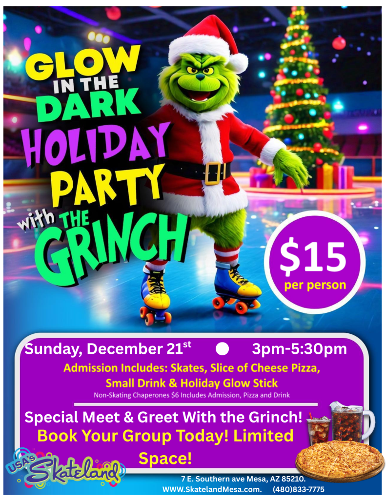 Roll into the holiday magic on Sunday, December 21st from 3:00pm–5:30pm at Skateland Mesa.