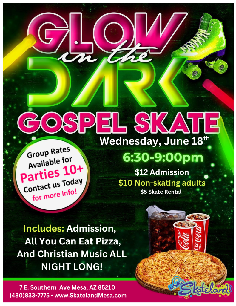 Join us for Gospel GLOW Skating Night—an evening where neon lights meet spirit‑lifting beats. Glide under black‑light skies to your favorite worship hits, grab glow gear at the door, and roll into fellowship, fun, and faith. Bring your friends, your brightest colors, and let’s shine His love on the rink! 🛼🎶