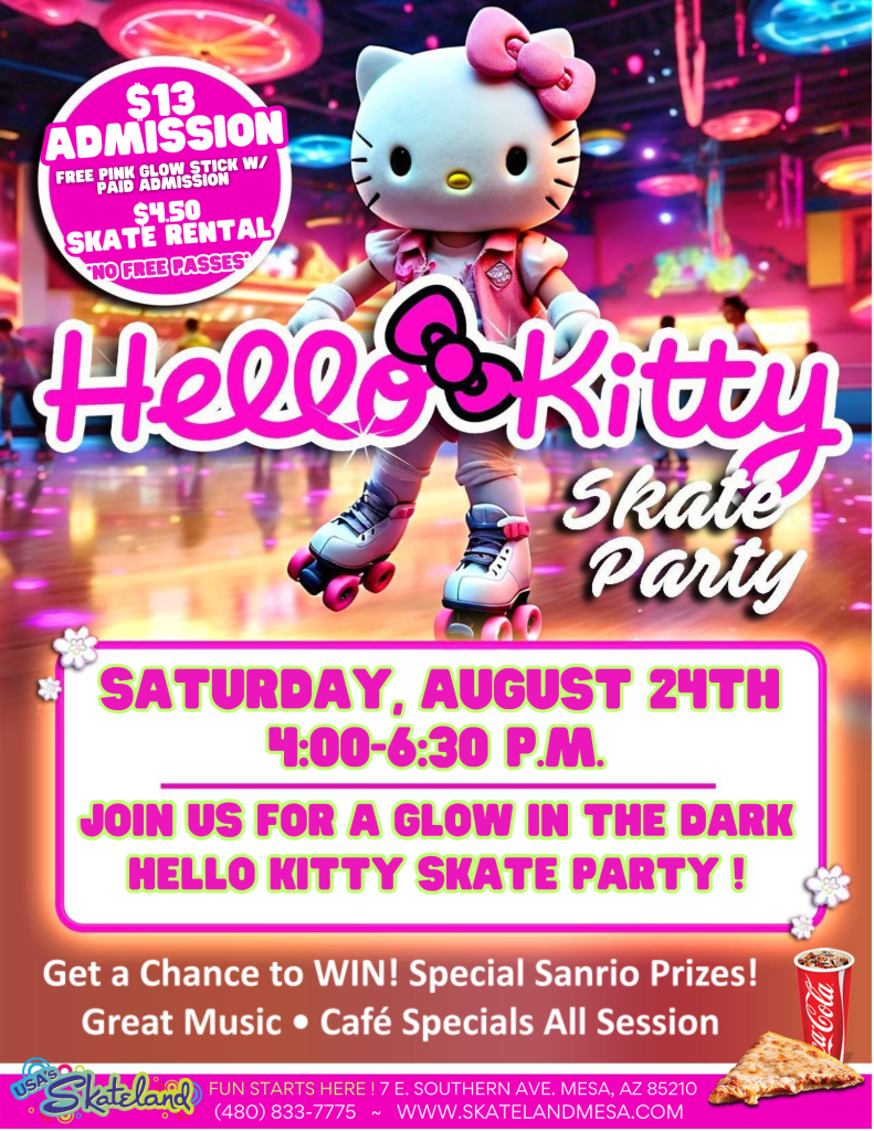 Join us for a glow in the dark Hello Kitty Skate Party from 4:00-6:30 P.M.
