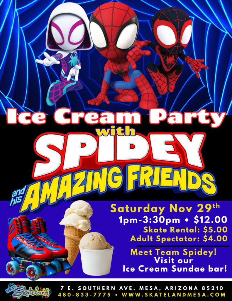 Meet Spidey and his amazing friends, enjoy delicious ice cream treats, and have a web-slinging good time on the rink.