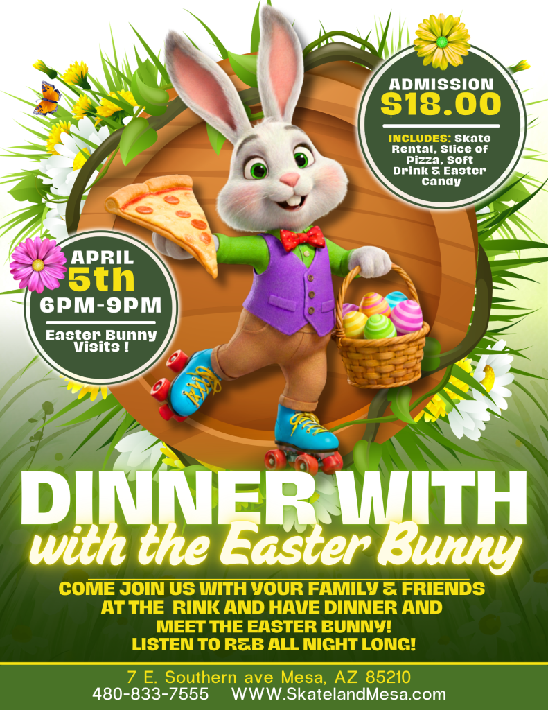 Join us for a fun-filled evening the whole family will love! πΌπ Come skate, enjoy a delicious dinner, and meet the Easter Bunny in person! Donβt forget to snap some adorable photos πΈ and soak in the festive spring vibes πΌπ£