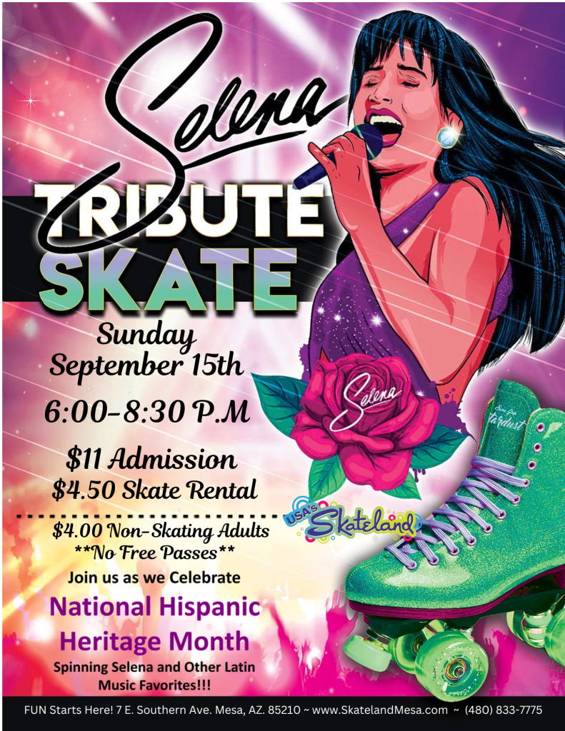 Join us from 6:00-8:30 P.M for a Selena Tribute Skate to celebrate the start of Hispanis Heritage Month !