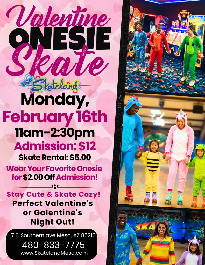 Valentine’s Onesie Skate is the coziest, cutest party at USA’s Skateland Mesa! 🛼💕🐻