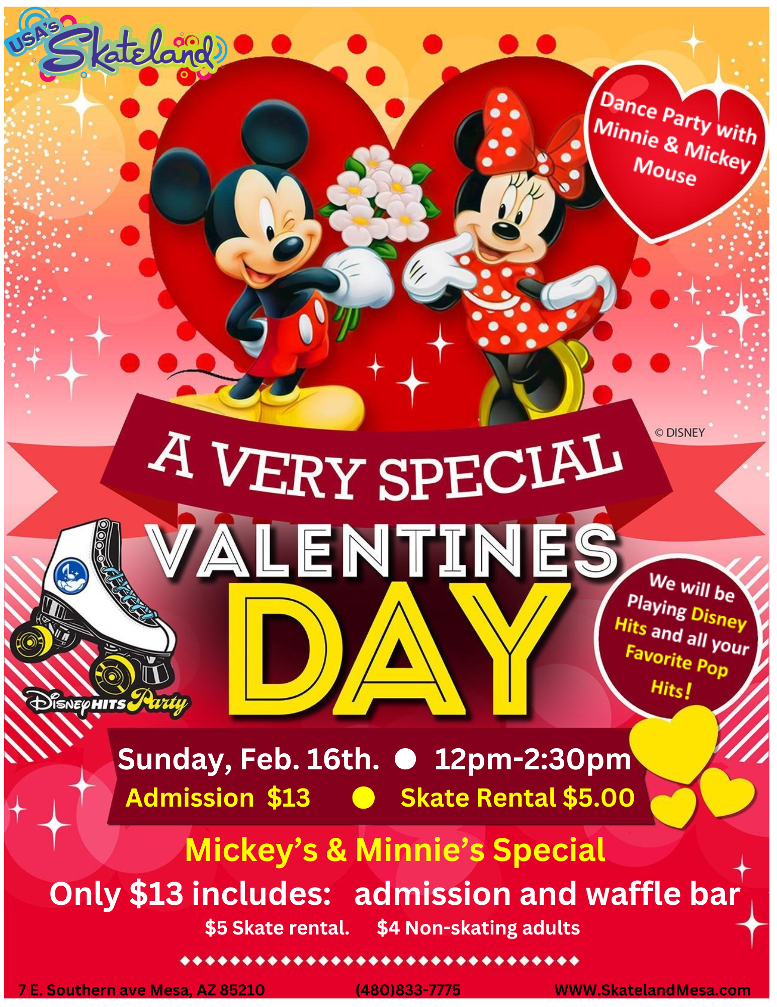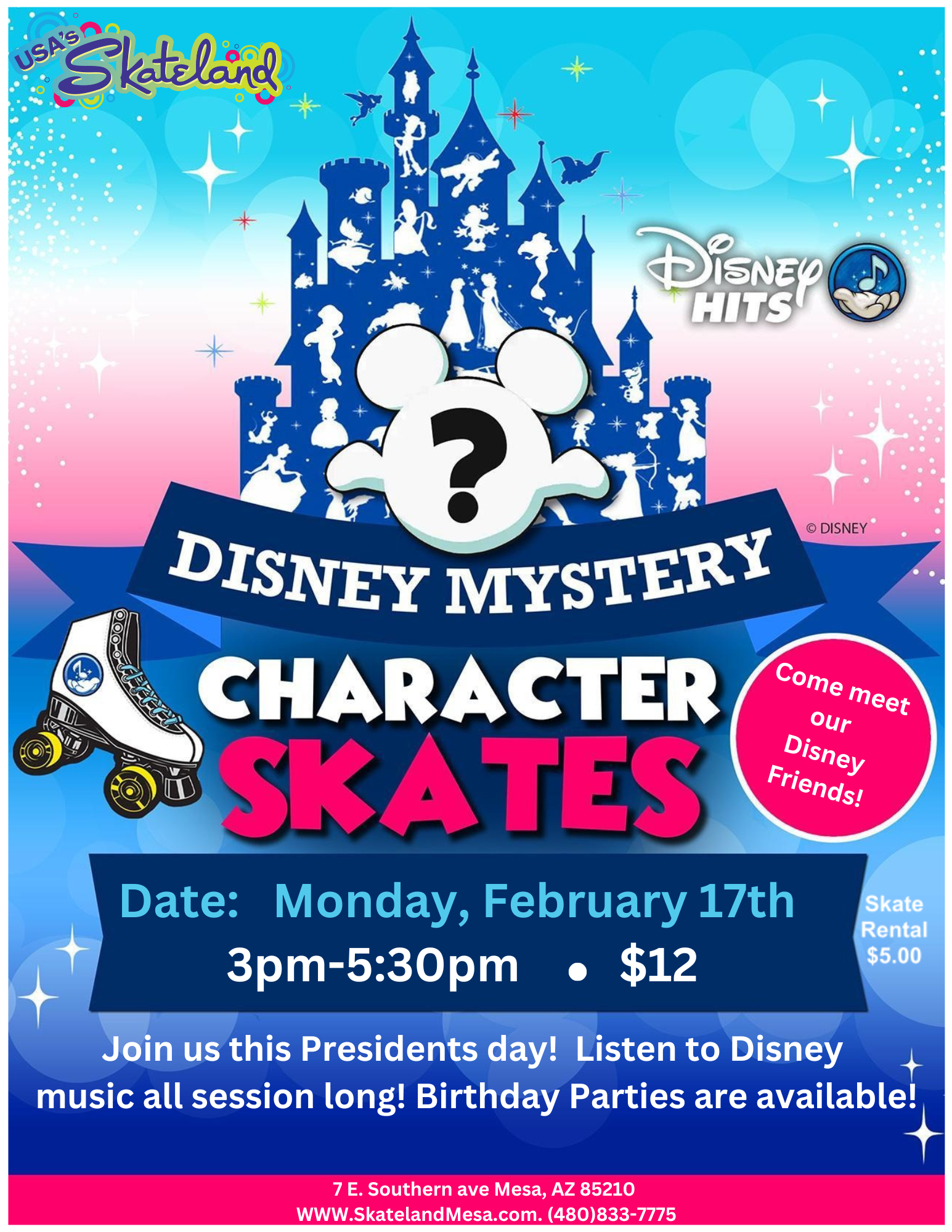 🍩Come eat some donuts and skate with Mickey and Minnie!🍩 Enjoy your favorite Disney music! Come take pictures with your friends Mickey and Minnie! $13 admission $5 Skate rental $4 Non skating adult Wristguards are Mandatory. Free of charge. No Outside Food or Drinks.