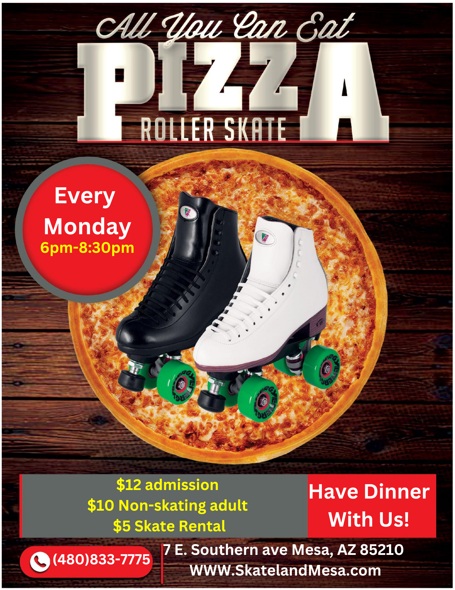 Come Eat Unlimited Pizza and Skate The Night Away! $12 admission $10 Non-skating adults $5 Skate rental |