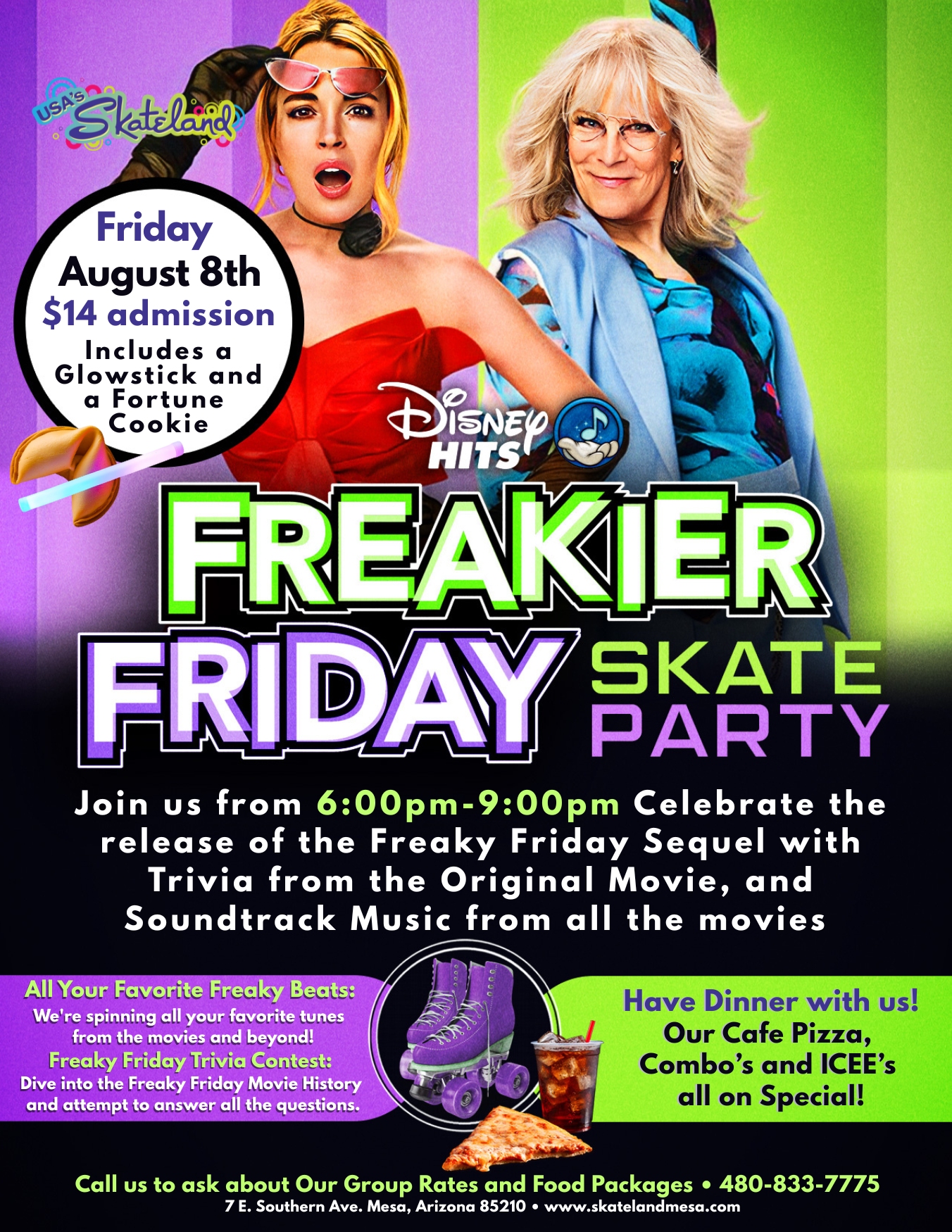 🌟🛼 FREAKIER FRIDAY SKATE PARTY! 🛼🌟 The 2025 Movie Magic Meets Glow-in-the-Dark Skating Fun! Ready to switch things up? Grab your skates and your wildest outfit because it’s time to flip the script at our Freakier Friday Skate Party – inspired by the NEW 2025 Freakier Friday movie! 🎬💫 📅 Date: Friday, August 8th 🕒 […] |