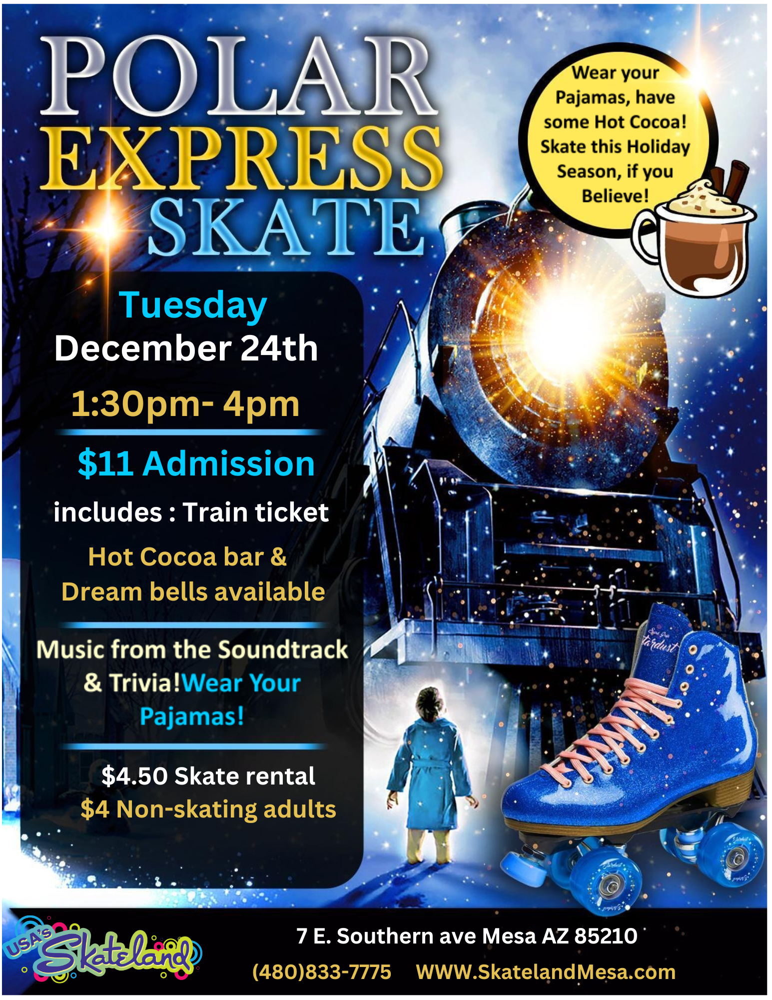 ❄️ All aboard the Polar Express skate❄️ Wear your Pajamas and come skate listen to your favorite soundtrack! Play Polar Express Trivia while watching the movie! 📷 Come take pictures with our train conductor!📷 ☕️ Hot Cocoa bar and Dream Bells Available!🔔 $11 Admission $4.50 Skate rental $4 Non-skating adult