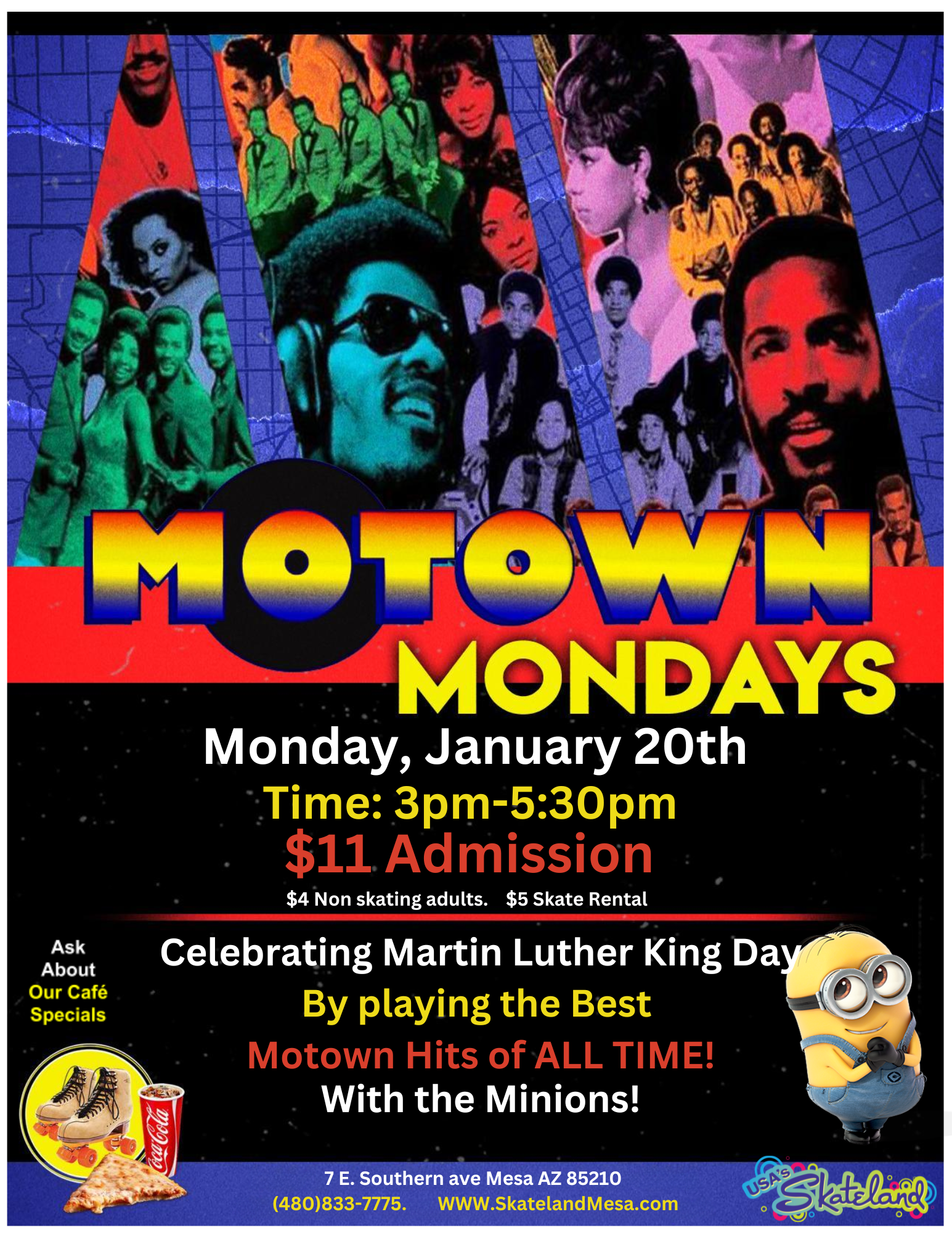 Celebrate Martin Luther King Day with us ! Join us to skate to ALL THE BEST MOTOWN HITS! 📷 Take Pictures with the Minions📷 $11 Admission $5 Skate Rental $4 Non Skating adults