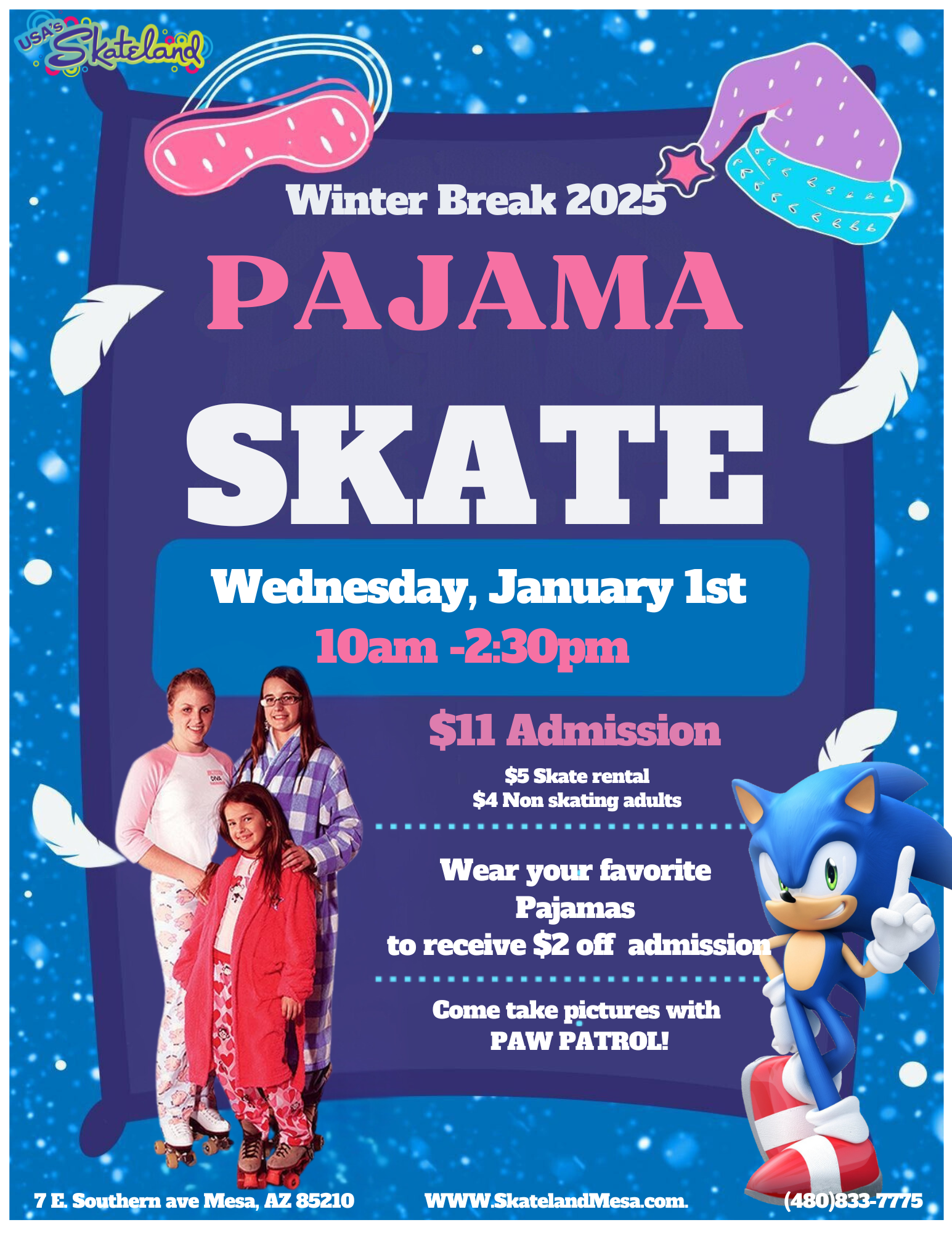 Join us for our PJ Skate with Sonic Come take pictures with Sonic Don't forget to wear your favorite PJs for $2 off! $11 Admission $5 Skate rental $4 Non […]
