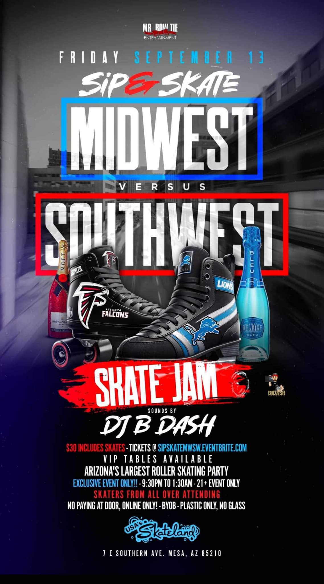 Exclusive Adult Night – 21+ Skate Night $30 includes Skates $50 VIP Tables includes Tickets Tickets at SipSkateMDSW.eventbrite.com Must have a ticket to enter! Wrist guards are required for this event!
