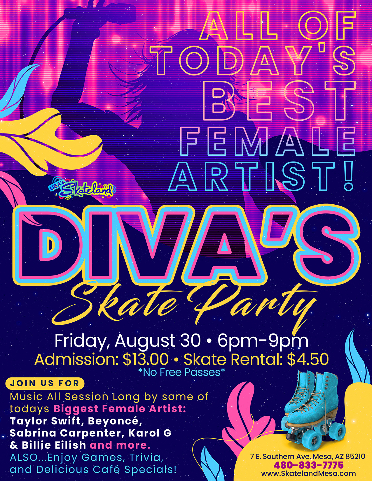 Come skate to today's best female artist ALL SESSION LONG !! We'll be playing music by Taylor Swift, Beyonce, Sabrina Carpenter, Karol G, Billie Ellish & so many more !! Enjoy games, trivia & delicious cafe specials ! $13 Admission $4.50 Skate Rental **No Free Passes**