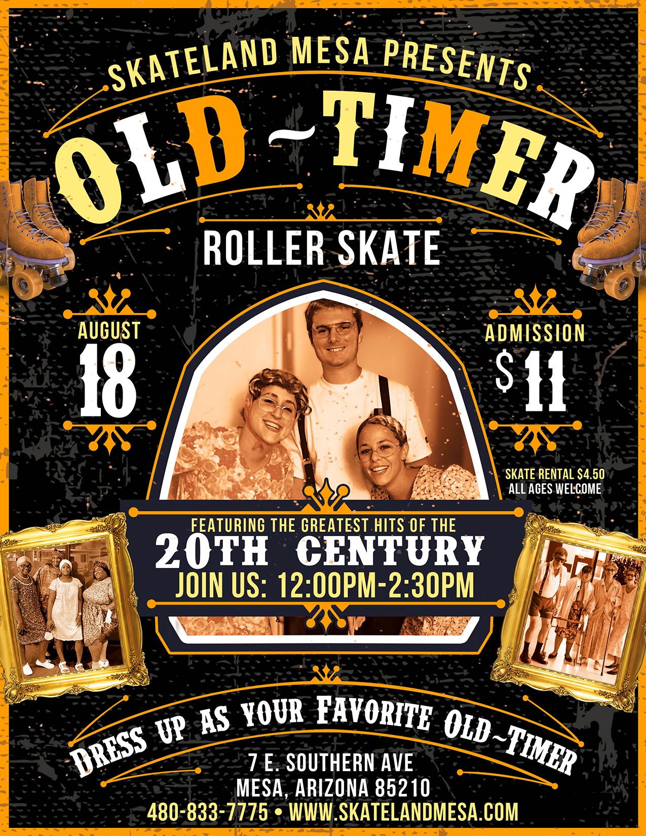 Dress up as your favorite Old Timer and join us from 12:00-2:30 P.M ! We'll be featuring the greatest hits of the 20th Century ! $11 Admission $4.50 Skate Rental **No Free Passes**