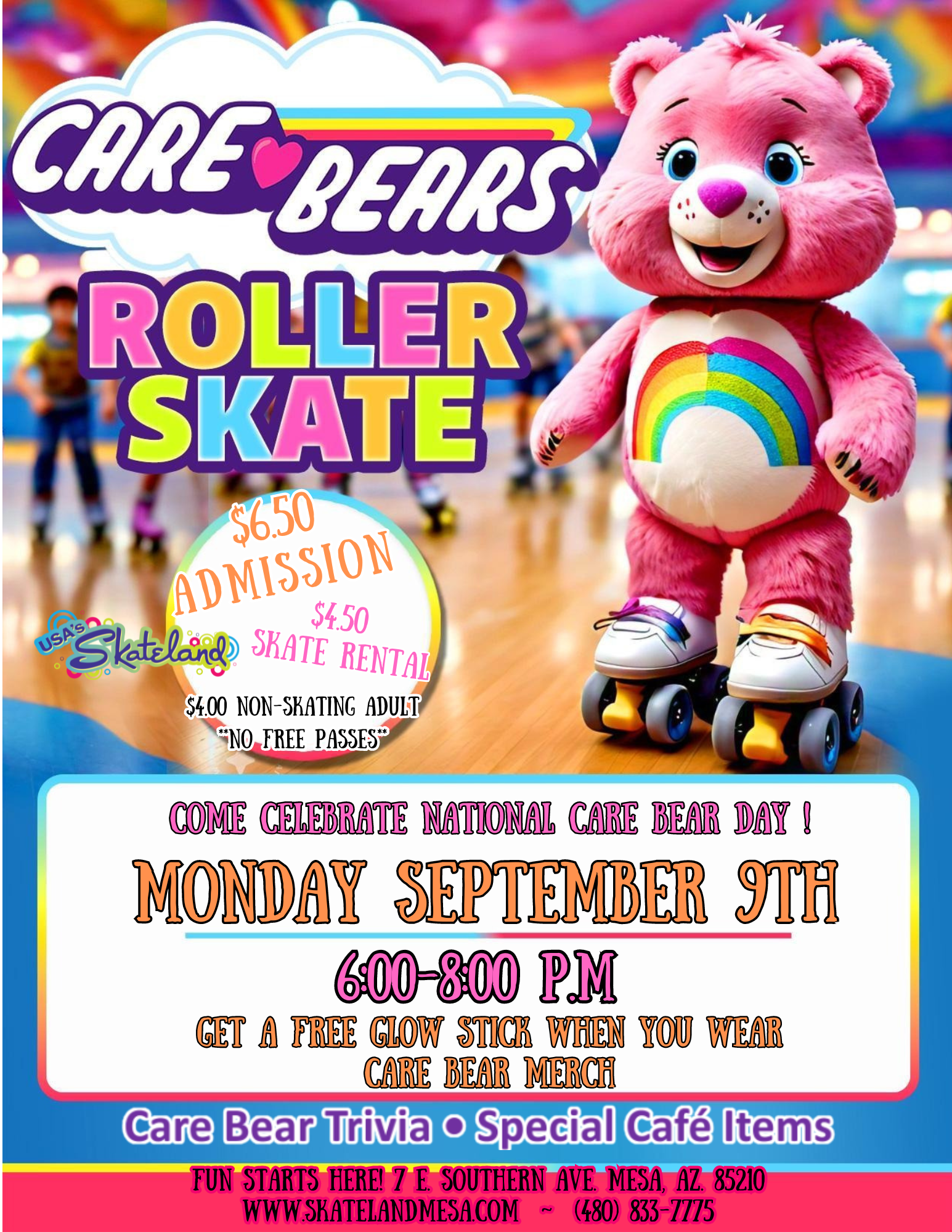 Come celebrate National Care Bear Day ! Join us from 6:00-8:00 P.M for some Care Bear Trivia, games & delicious cafe specials ! $6.50 Admission $4.50 Skate Rental $4.00 Non-Skating Adulta Get a FREE glow stick when you wear your favorite Care Bear Merch ! **No Free Passes**