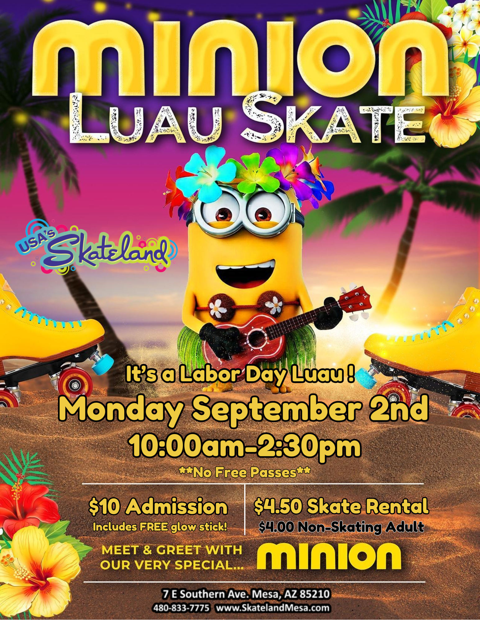 It's a Labor Day Luau ! Meet & greet with our very special MINION ! Join us from 10:00 am - 2:30 pm for this extra special Labor Day celebration ! $10 Admission (includes FREE yellow glowstick) $4.50 Skate Rental $4.00 Non-skating adults **No free passes**