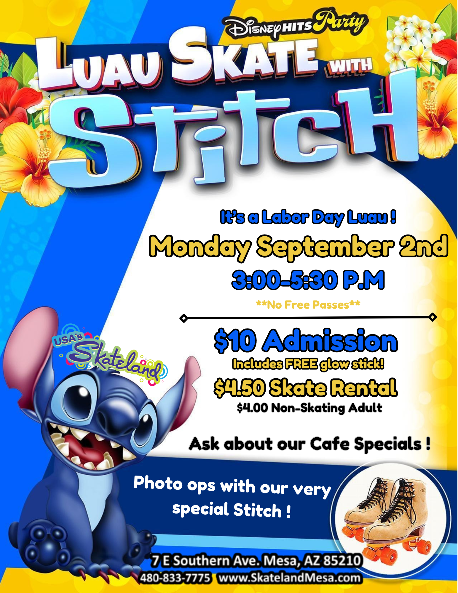 It's a Labor Day Luau ! Join us from 3:00-5:30 P.M. for this extra special Labor Day ! Enjoy our delicious cafe specials, games & photo ops with our very special Stitch $10 Admission (includes FREE blue glow stick) $4.50 Skate Rental $4.00 Non-skating adults **No free passes**