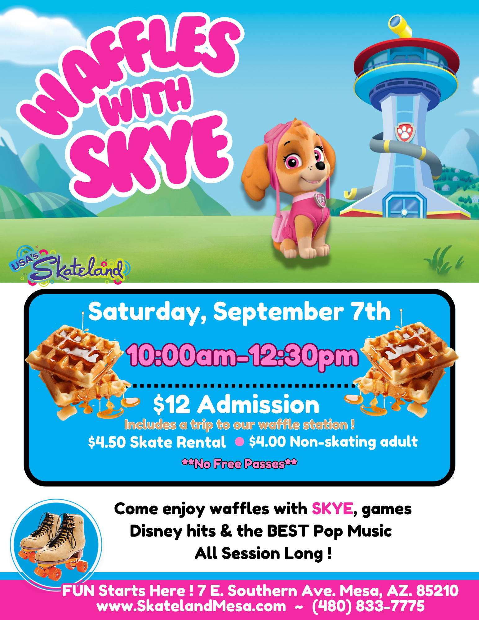 Join us from 10:00 a.m - 12:30 P.m for a delicious event ! Enjoy games, cafe specials, photo ops with our very special Paw Patrol friend SKYE & tons of FUN ! $12 Admission includes FREE trip to our waffle station ! $4.50 Skate Rental $4.00 Non Skating Adults **No Free Passes**
