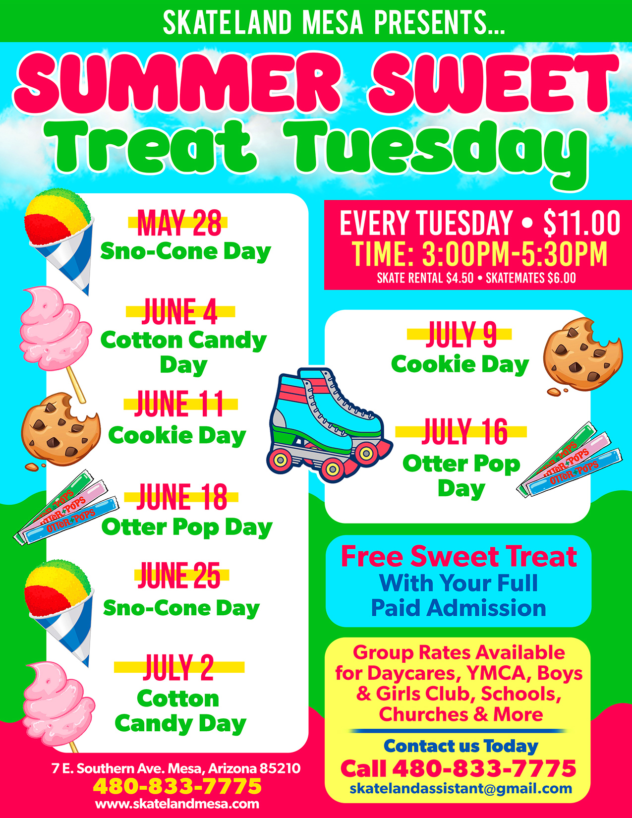 Sweet Treat Tuesday – Summer Skating May 28 Sweet Treat Tuesday – Summer Skating 3:00 pm - 5:30 pm Recurring