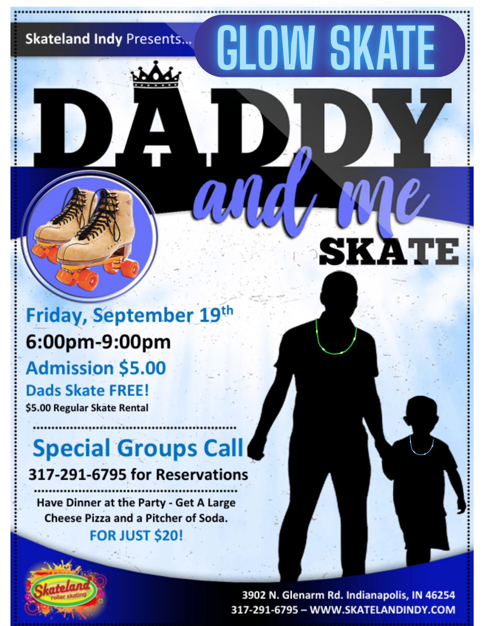 It’s Glow TIME!!! Calling all dads — it’s your time to shine (and skate)! All dads accompanied by their children get in FREE. Come make memories, roll together, and enjoy some quality family fun!