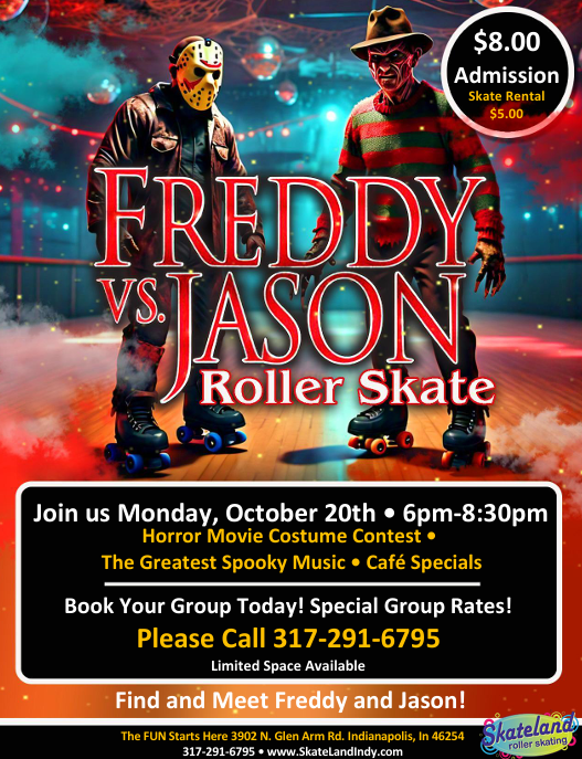 It’s Freddy Vs. Jason Halloween Skate. Who is your favorite? Come dressed in your favorite Horror Movie character and roll out!
