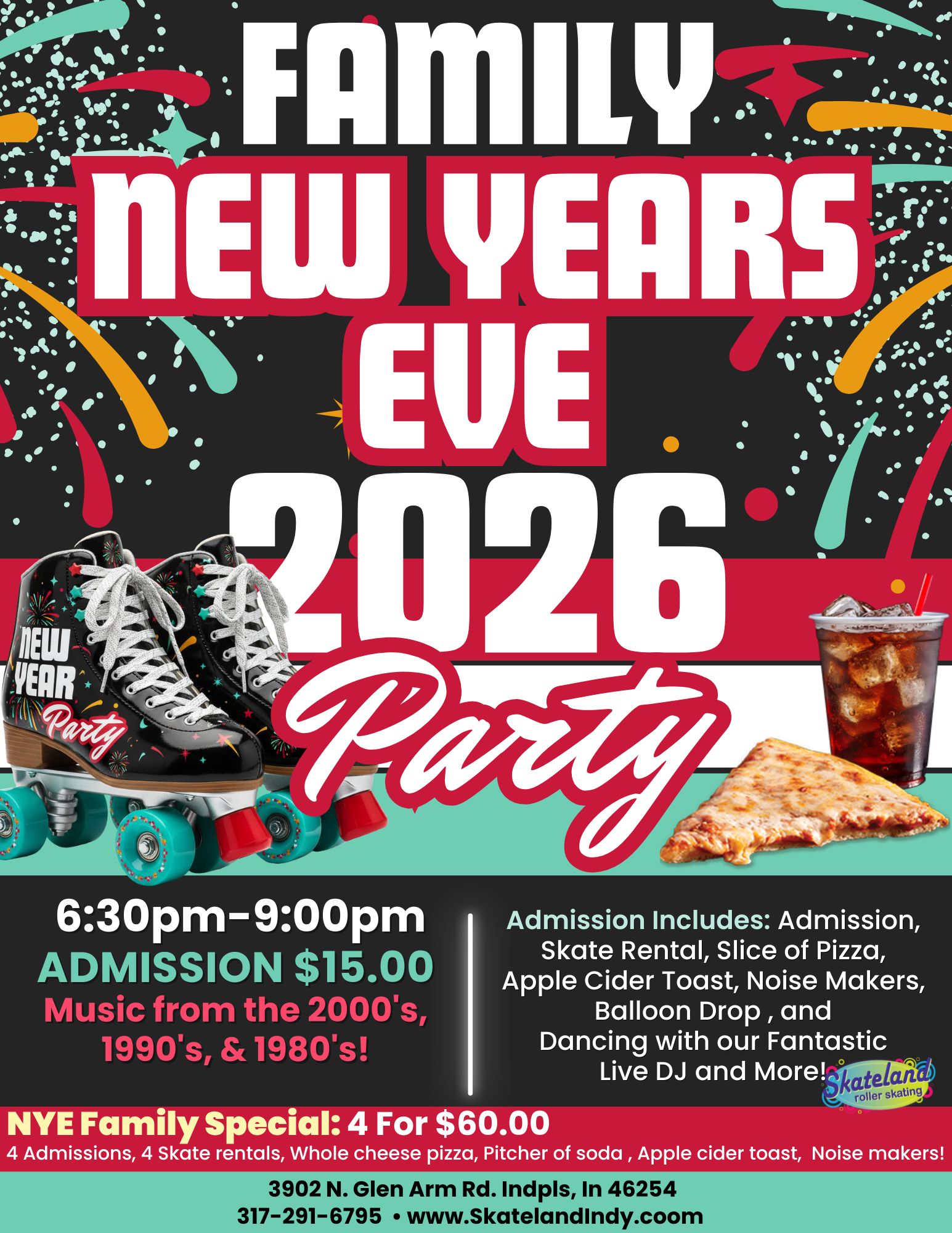 $15.00 Admission, Skate Rental, Slice of Pizza, Apple Cider Toast and a BIG Balloon Drop