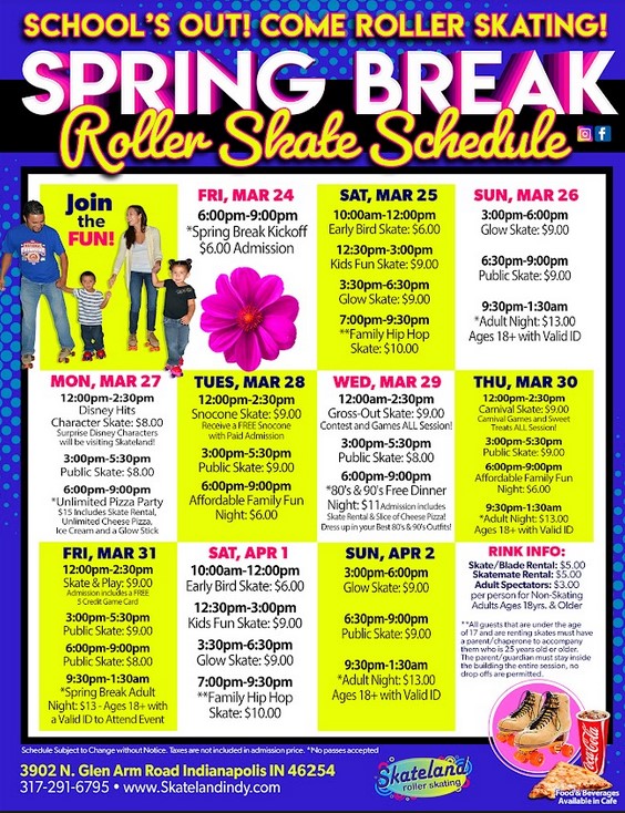 Spring Break Roller Skating is Friday March 24th 2023 through Sunday, April 2nd 2023.