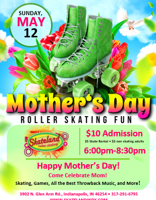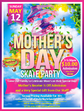 Come celebrate MOM on Sunday, May 12 3:00pm - 5:30pm Admission: $10.00 Skate Rental: $5.00 Non-Skating Parents: $3.00 All Mothers will receive 1/2 prices admission and a FREE gift from us! Group rates available!