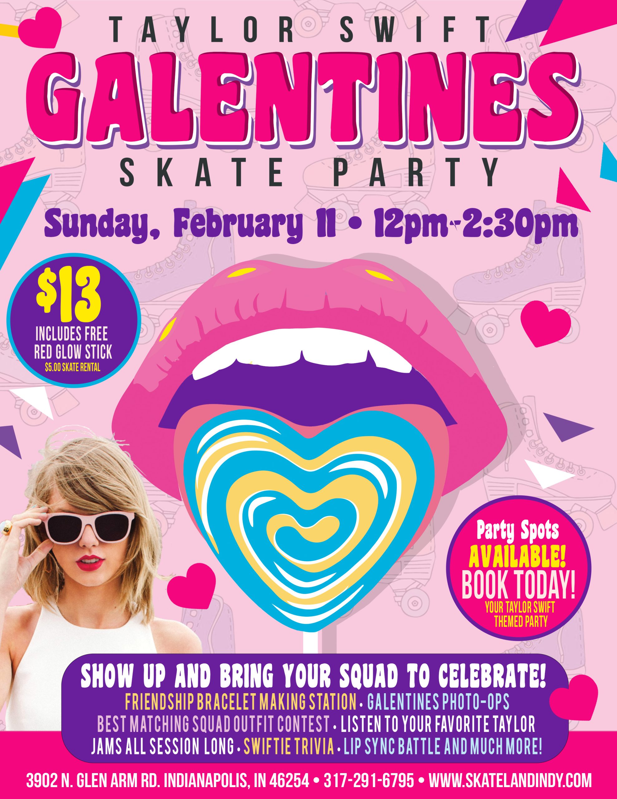 Show up and bring your squad to celebrate! Friendship bracelet making station Galentines photo-op Best matching squad outfit contest Listen to your favorite Taylor Swift Jams Swiftie Trivia, Lip Sync Battle and much more! $13 admission $5.00 skate rental admission includes red glow stick Book your swiftie birthday! Birthday parties available