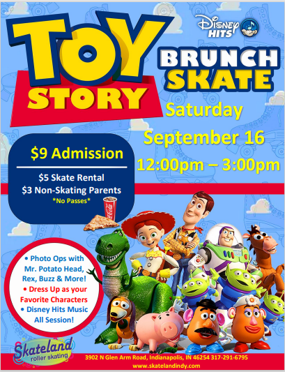Join is for Roller Skating and Toy Story Character Meet and Greets! Saturday, September 16 12:00pm - 3:00pm Admission: 9.00* Skate Rental: $5.00 Non-Skating Parents: $3.00 Disney Hits Music all session long.
