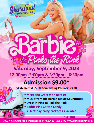 Come on Barbie let's go Roller Skating Think Pink - Pink the Rink Wear PINK to Pink the Rink Meet and Greet with Barbie 3:30pm - 6:30pm Admission: $9.00 Skate Rental: $5.00 Non-skating parents: $3.00