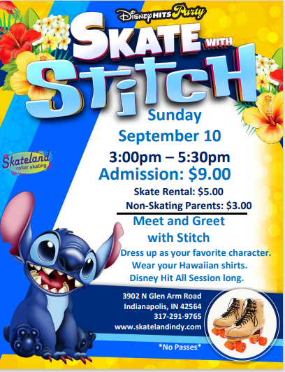 Disney Hits Party with Stitch Sunday, September 10 3:00pm -5:30pm Admission: $9.00* Skate Rental: $5.00 Non-skating parents: $3.00 *No passes