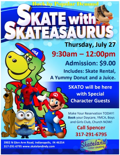 Thursday, July 27 9:30am - 12:00pm Admission$9.00 includes skate rental, donuts and a juice* *No Passes/all guests pay admission* Make your group reservation today! Meet and greets with Skato, Mario, Minion, Scooby Doo, Spiderman and Bluey