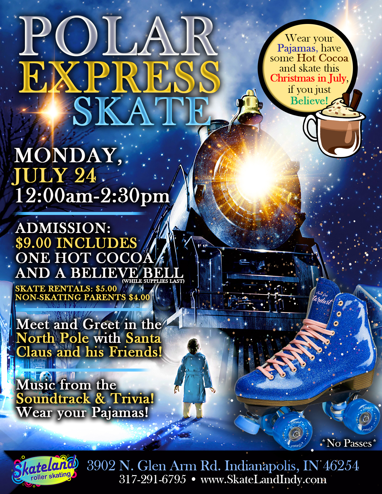 Monday, July 24, 2023 12:00pm - 2:30pm Admission: $9.00 Skate Rental: $5.00 Non-Skating Parents: $3.00 excludes the hot cocoa and bell *No Passes* FREE cup of Hot Cocoa and a "Believe" Bell (while supplies last) with FULL paid admission Come skate to the soundtrack, see Santa and friends, trivia from the movie.