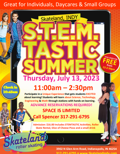 Come learn about STEM - Science, Technology, Engineering and Math! Space is limited so sign up today! We will have a 1 hour all hands on STEM lesson. $16.00 per person: Admission, skate rental, one slice of cheese pizza and a small drink* STEM 11am -12pm Lunch 12pm - 12:20pm Skating 12:20pm - 2:15pm Dance […]