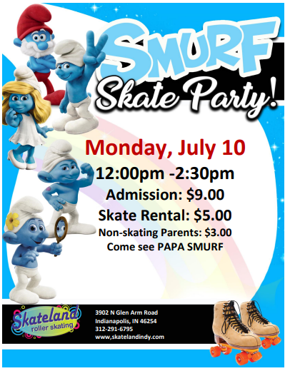 Come see Papa Smurf Monday, July 10 12:00pm - 2:30pm Admission: $9.00 Skate Rental: $5.00 Non-skating Parents: $3.00