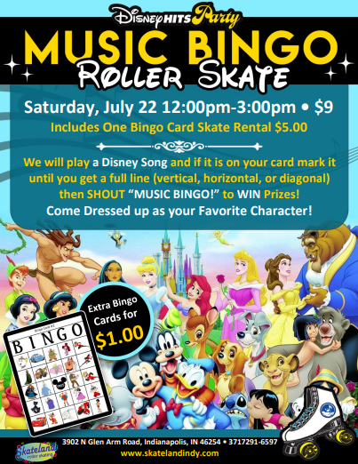 Join us for our Disney Hits BINGO Party Skate 12:00pm - 3:00pm Admission: $9.00 includes one bingo card. Skate Rental: 45.00 Non-skating Parents $3.00 We will be playing all the best Disney Hits - If that song is on your bingo card mark it off for a chance to win! More bingo cards available for […]