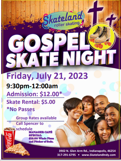 Come skate to the best Gospel Songs. Youth Group Rates available. Friday, July 21 9:30pm - 12:00pm Admission: $12.00* Skate Rental: $5.00 Non-Skating Parents: $3.00 *No Passes*