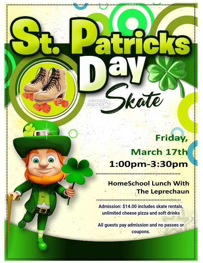 Happy Saint Patrick's Day Admission: $14.00 includes skate rentals, unlimited cheese pizza and soft drinks All guests pay admission and no passes or coupons. Lunch will be served from 2pm - 3pm Come see the lucky Leprechaun