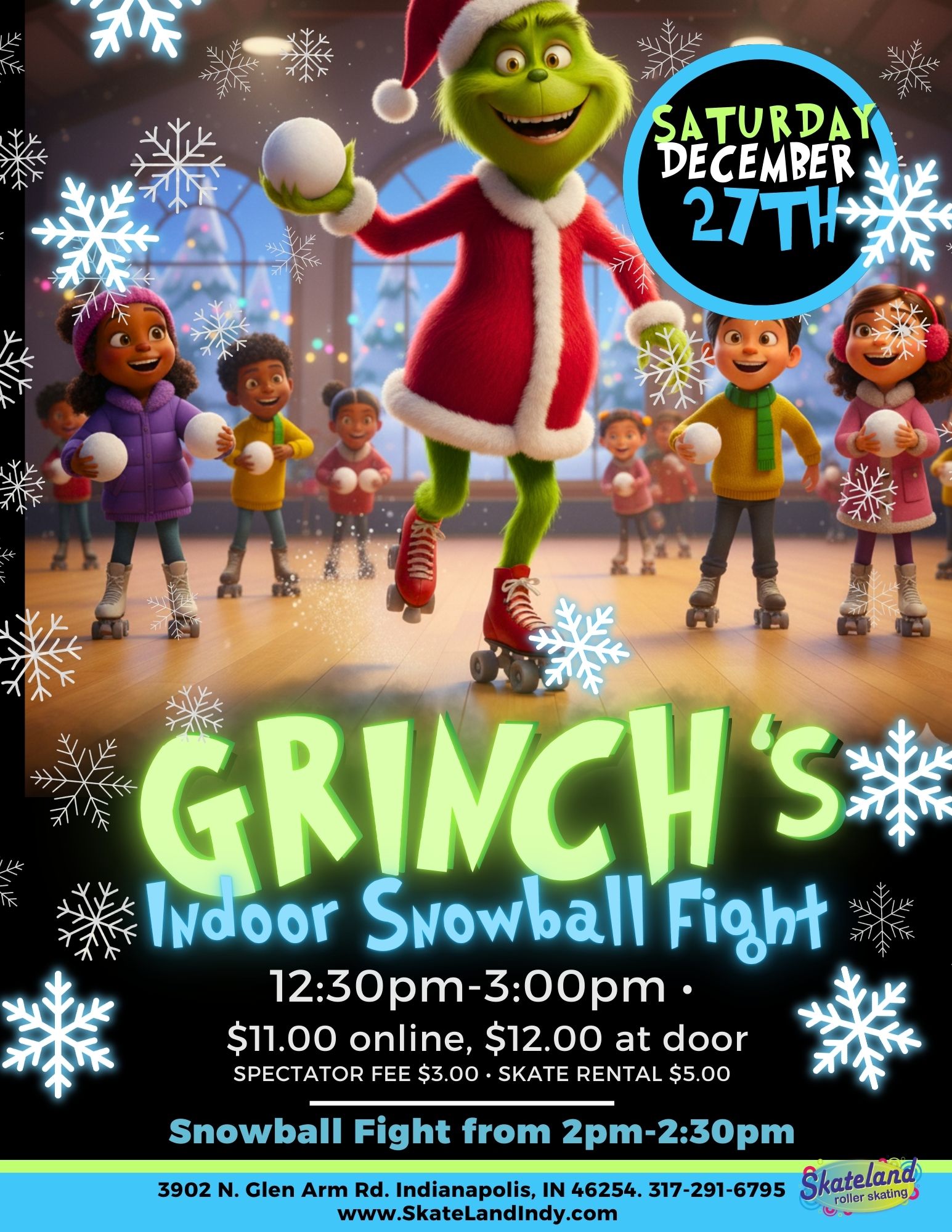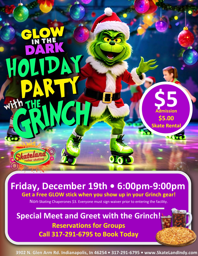 Come have fun with the Grinch during our Family Glow Session $5.00 Admission$5.00 Skate Rental$3.00 spectator fee Free GREEN Glow Stick if you wear Any Grinch gear! Come dressed up as the Grinch if you want!