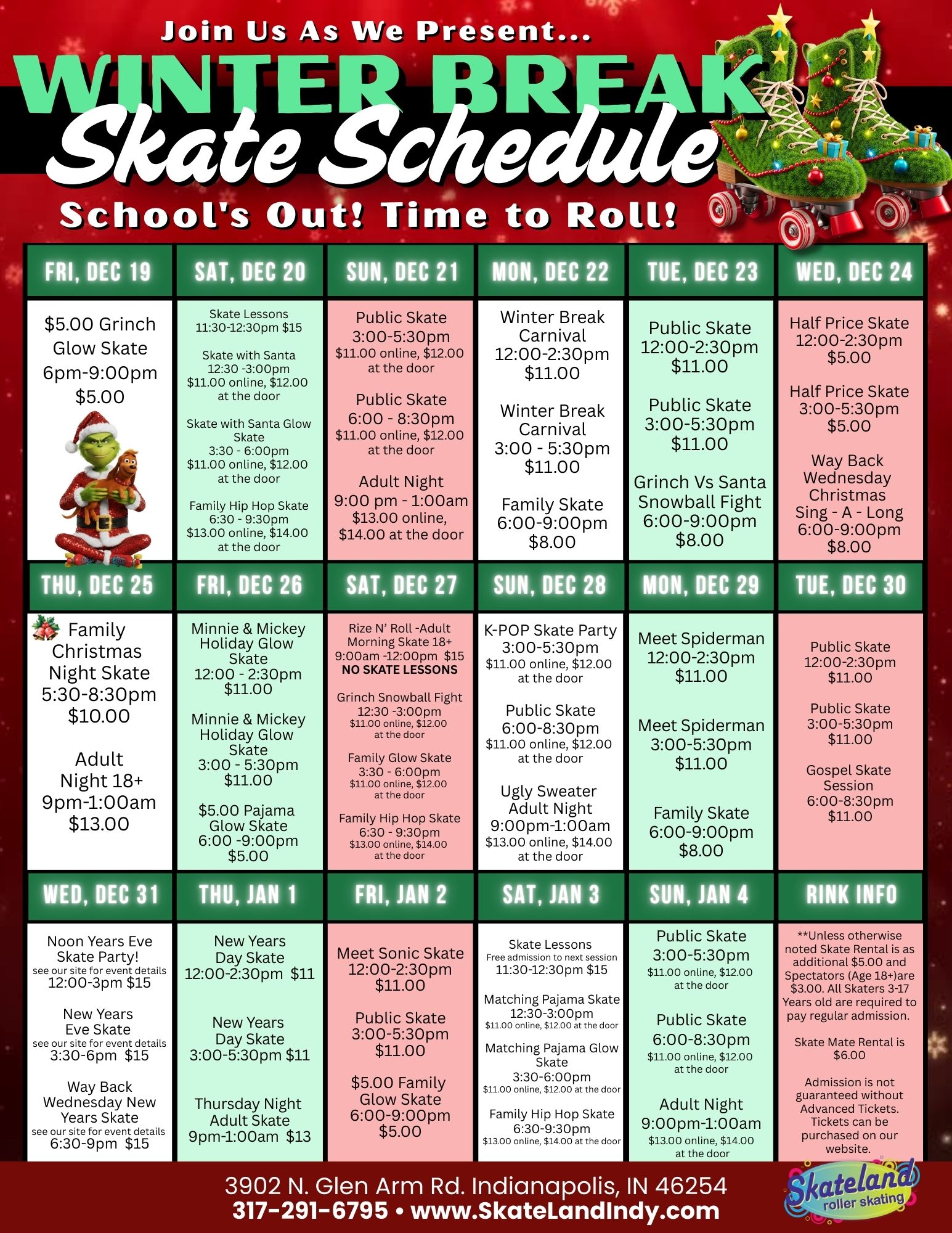 School’s out and the fun begins! Join us every day of Winter Break for themed skate sessions, great music, family events, and special holiday celebrations. From Christmas Eve Skate to New Year’s Eve Parties, we’ve got something for everyone. Get your tickets early and roll into the holiday fun! GET TICKETS HERE